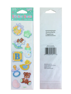 These cute baby stickers feature icons associated with little ones: bib, baby buttons, baby bear on a rocking horse, baby bottle, block with a letter B, yellow rubber ducky, pacifier, and a brown teddy bear. Acid and lignin free, great to use as party seals, on cards, envelopes or for scrapbooking.