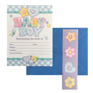 Baby's Quilt Baby Boy Birth Announcement Cards 8 CT - Blue Checkered Hearts Flowers & Stars