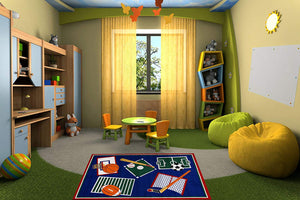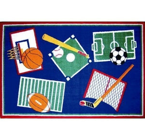 Great sports rug shows the sports balls and fields/icons of the most loved sports: football, basketball, soccer, baseball and hockey. Add a final finishing touch to any sports themed room with this wonderful, non-skid backing, 100% nylon, medium pile rug. 39" x 58".
