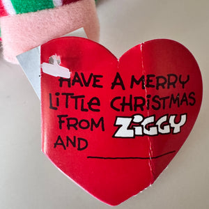 Ziggy is all dressed up for Christmas as an elf in red and green striped top with matching red / white Santa hat, and is wearing brown reindeer slippers. There is a red heart in the center of his chest with writing 'I LOVE YOU' on it. Great gift to yourself, friend, loved one, or for any avid Ziggy collector!