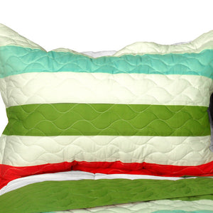This stylish quilt set features alternating stripes of green, red, aqua blue and off-white colors that will match a wide range of bedroom decor. 100% polyester fabric with 100% polyester fill, pre-washed, pre-shrunk, reversible and hand-quilted for elegance and durability. Fine and concentrated stitches. Machine washable, cold water, gentle cycle.