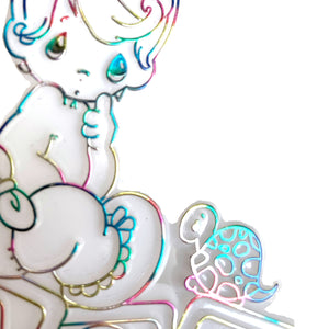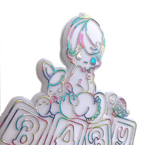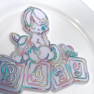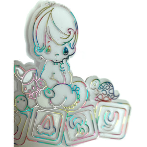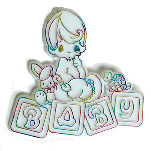 Vintage Precious Moments Baby Shower Cake Topper Plastic 3 3/4" x 3 1/2" New Baby Arrival Plaque Decor Bunny Turtle BABY Alphabet Letter Blocks