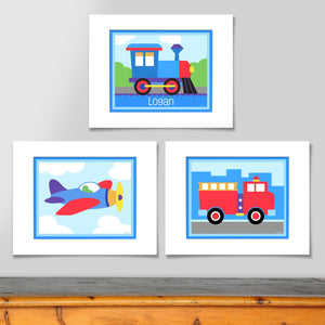 Transportation Vehicles Wall Art Prints Personalized - Set of 3 - Train Air Plane Fire Truck