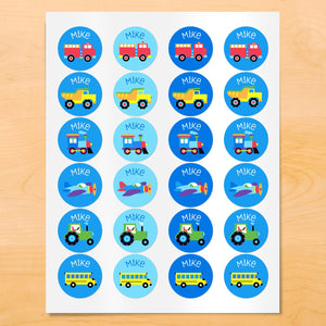 Trains, Planes, Trucks Personalized Round Waterproof Labels 24 CT