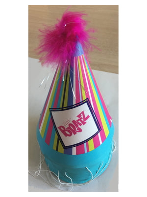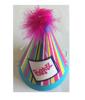 Bratz Happy Birthday Party Perfection Hats 8 CT - Striped Blue & Purple with Hot Pink Boa Pom Pom