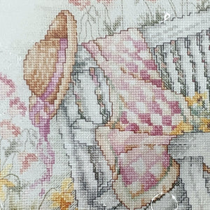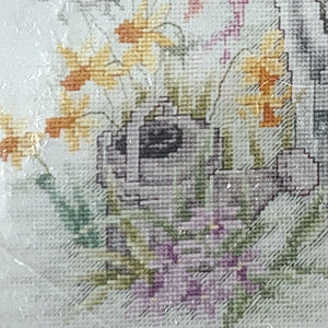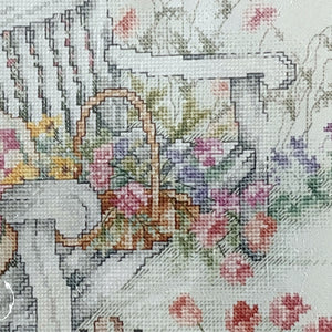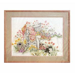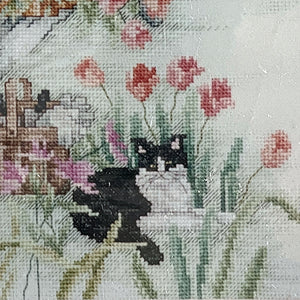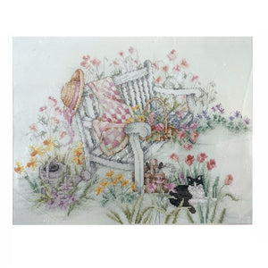 Vintage Cross Stitch Kit Serene Garden Bench with Flowers Basket Watering Can & Black / White Tuxedo Kitty Cat 15" x 12" by Donna Giampa - Janlynn