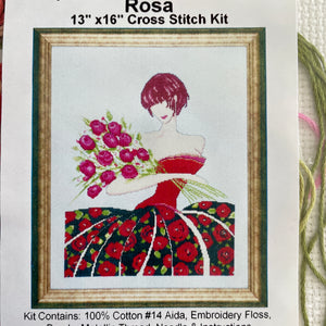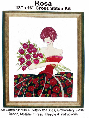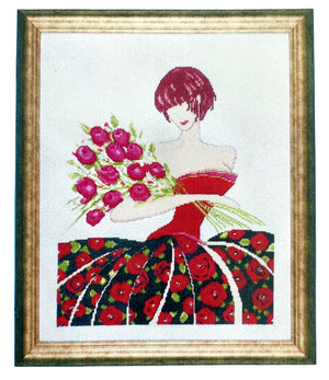 Vintage Rosa Elegant Fashion Woman with Red Roses Flower Bouquet Counted Cross Stitch Kit 13" x 16"