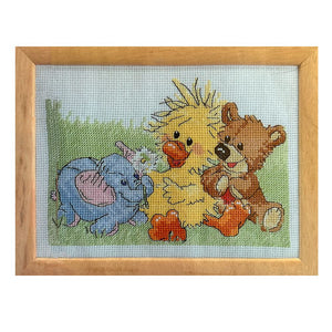 This adorable counted cross stitch chart pattern features lovable Little Suzy's Zoo characters, a baby duck Witzy, Boof Bear, and elephant Ellie Phant holding a dandelion wishing puff for Witzy, all sitting in the grass. Adorable for a baby's nursery, great as a new baby shower gift!