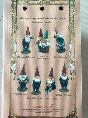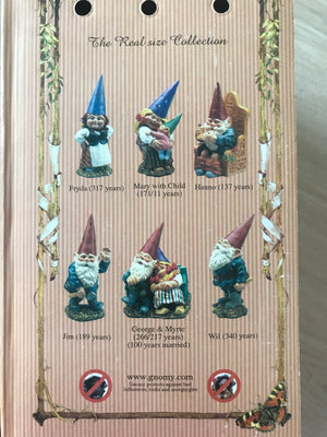 Box describes this forest gnome as a 275 years of age, in the prime life, true height of 15 cm (6"). Different gnomes are shown on two opposite sides of the box by name and age: Fryda, Mary with Child, Hanno, Jim, George & Myrte, Wil, Herman, Dave & Iris, Rien, Floor, Dave, Sjef, Wilfred. All between 0-400 years of age which is a normal lifespan of a Gnome. :)