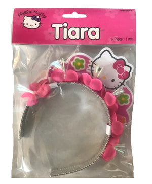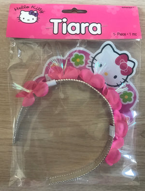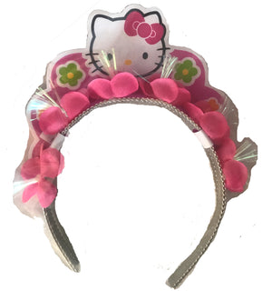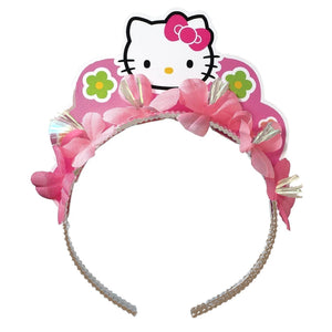 This Hello Kitty tiara will make your Birthday girl the princess of the party!  It features a silver headband with pink fabric flowers & paper cutout at the top with an image of Hello Kitty head surrounded with green and orange flowers.