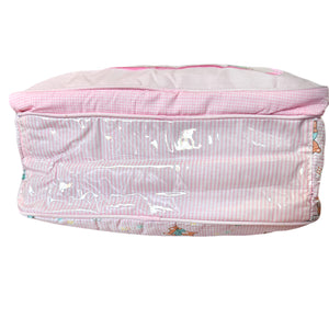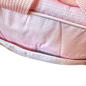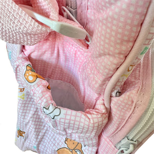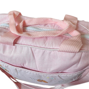 This beautiful, functional and rare diaper bag in pink color features a cute baby bear and squirrel animal fabric print. The front zippered pocket features embroidered Precious Moments themed girl character with butterflies on the right side and large colorful 'BABY' lettering on the left side. The scene is surrounded by a pink  embroidered ribbon and white bow. This darling adjustable strap diaper bag has enough space to hold all the baby necessities on the go.