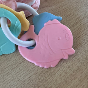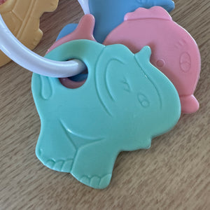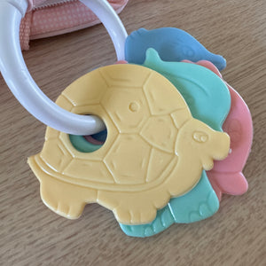 • Removable teething ring with four animal characters: green elephant, pink fish, blue duck, yellow turtle