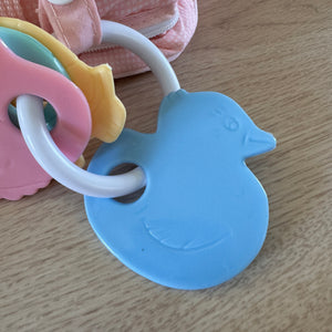 Attached as a bonus is a removable teething ring / toy with four animal shaped characters: duck, elephant, fish, and turtle. Hard to find, one-of-a-kind item, great present for a new baby, a baby shower or baby welcoming gift for parents!