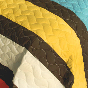 This colorful and modern teen boy quilt set features alternating vertical stripes of contrasting colors of brown, sky blue, bright yellow, orange and off-white colors. Reverses to solid blue. 100% polyester fabric with 100% polyester fill, pre-washed, pre-shrunk, reversible and hand-quilted for elegance and durability. Fine and concentrated stitches. Machine washable, cold water, gentle cycle.