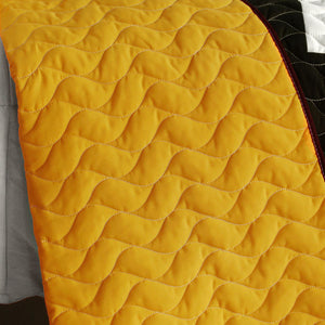 100% polyester fabric with 100% polyester fill, pre-washed, pre-shrunk, reversible and hand-quilted for elegance and durability. Machine washable, cold water, gentle cycle.
