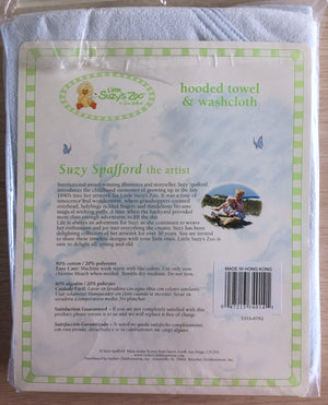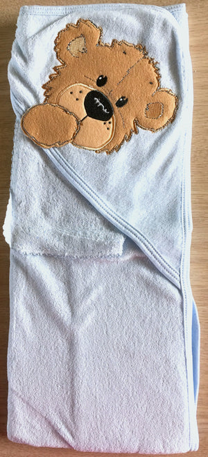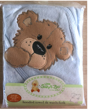 Vintage New Little Suzy's Zoo Blue Infant Baby Hooded Towel & Washcloth Set Boof Brown Bear Appliqué 30" x 26"