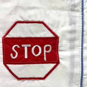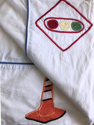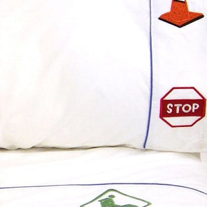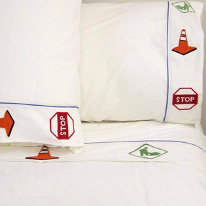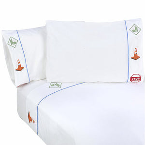 Cotton Road Construction Signs Queen White Linen Kids Bed Sheets Set for Boys Embroidered