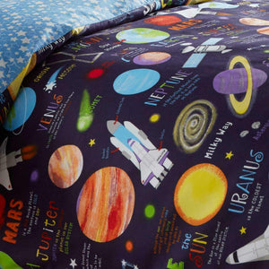 This elegant, fun and colorful outer space duvet bedding will fit perfectly into your child's bedroom! Dark blue background on one side with planets and their descriptions, space shuttles, satellites and shooting stars are combined with a reversible light blue fabric with printed white star. The duvet cover has a hidden button closure on the bottom.