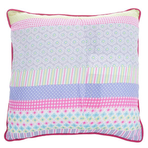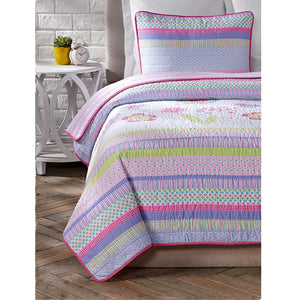 Dress up your girl's room with this beautiful pink green and purple floral striped quilt set! The matching quilt and sham feature a bright floral pattern in vibrant eye-catching colors.  Made of 100% cotton face and fill and pre-washed and preshrunk for easy care.