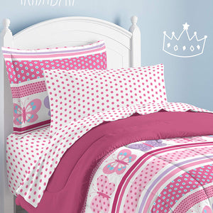 This beautiful butterfly dots bedroom ensemble has several shades of pink, ranging from pale pink to deep rose, complemented with purple, blue and white colors. The face of the comforter and standard flanged pillow sham features a horizontal design of butterfly prints, with bands of horizontal dots and stripes. It reverses to a solid deep rose. The easy-care sheets and pillowcases feature an all over rose polka dot print on a pure white background. All components are made of an ultra-soft, 100% microfiber polyester fabric and are machine washable.