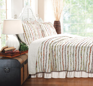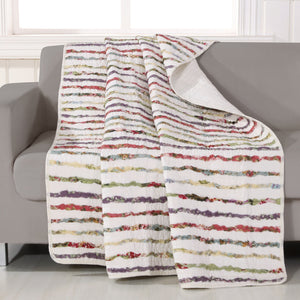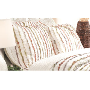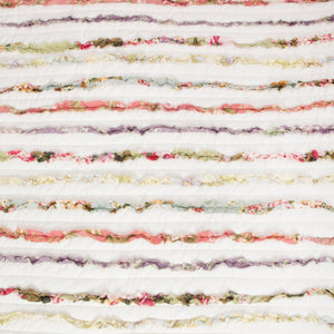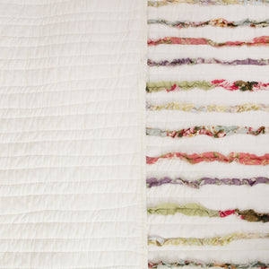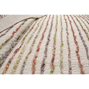 Your girl will love the timeless look of this shabby chic soft cotton quilt set! Ruffles of floral printed fabrics of reddish, blue and green hues are carefully sewn to a ivory background on the face of this frayed edge quilt, giving it an antique look and feel. Brings shabby chic style with a variety of colors to any room, matching a wide range of color themes. Quilt is oversized for better mattress coverage. Reverses to solid color.