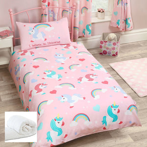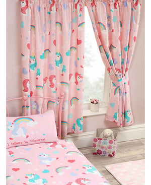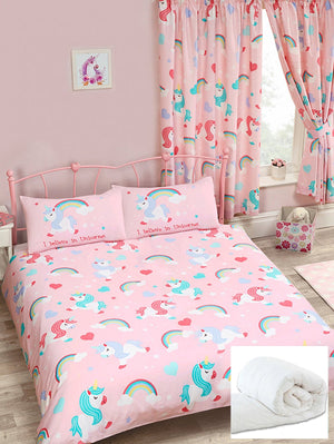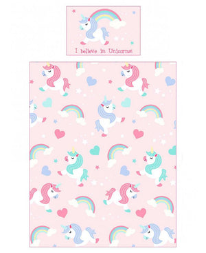This adorable little girl unicorn duvet cover bedding features cute white unicorns with colorful manes and tales, rainbows with clouds, hearts and little stars on a soft pink background. A pillowcase features a matching unicorn with rainbow and writing 'I believe in Unicorns!' The duvet cover has a button closure on the bottom.