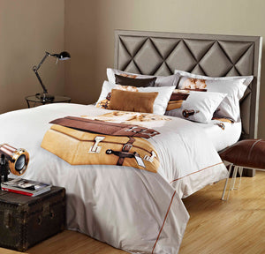 This luxury, designer bedding set features a photo real print of adorable baby leopards on their safari travels, sitting on suitcases, and a large telescope beside them to explore the world. All printed on a cream background. The softness of the 100% combed cotton and the distinct gift packaging make these bedding sets a great choice for a gift.