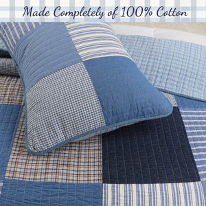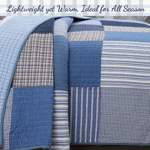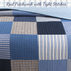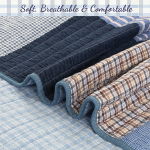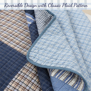 From modern to classic, this versatile patchwork quilt set will match a broad range of bedroom designs. Alternating brighter and darker squares feature stripes and plaids of different shades of blue, white and gray. Reverses to a matching blue and white plaid pattern. Excellent elegant choice for a boy's, teen boy's or guest bedroom!