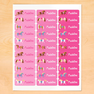 Bring the stable to your little one with these personalized waterproof labels! Includes a variety of horses on three shades of pink and features your little one's name!