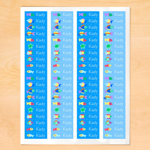 These tropical fish waterproof mini labels feature three different fish and a sea turtle on a blue background, and your little one's name!