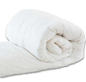 White duvet insert is made with hypoallergenic polyester fill and cotton or polyester/cotton blend fabric.