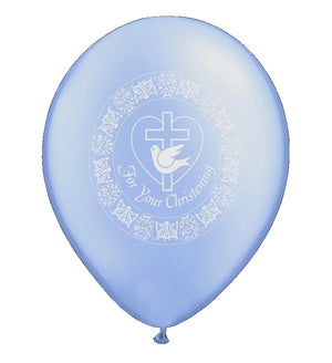 Celebre el bautizo de su bebé con estos hermosos globos de látex perlado. Cada juego incluye seis globos azules con una paloma blanca, una cruz y un corazón en el centro.