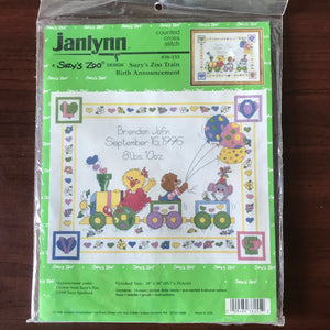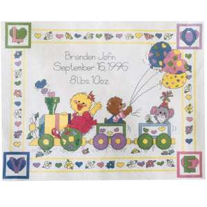 Kit de punto de cruz contado o patrón en PDF con instrucciones para el viaje en tren de animales bebés con globos del zoológico de Suzy, muestrario de recuerdo para el anuncio del nacimiento del bebé Janlynn 1996