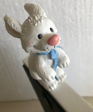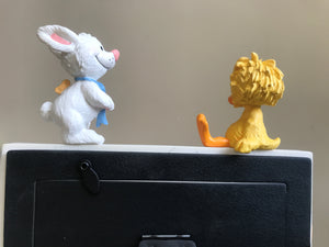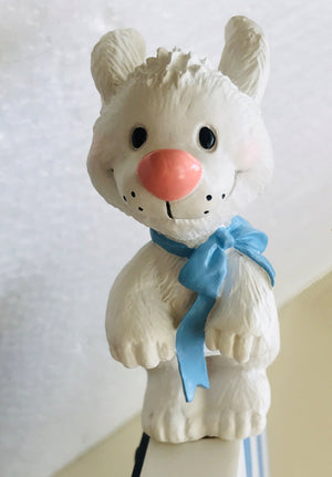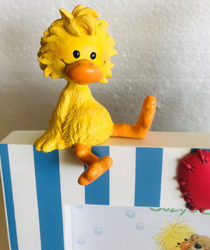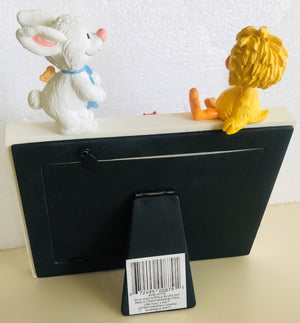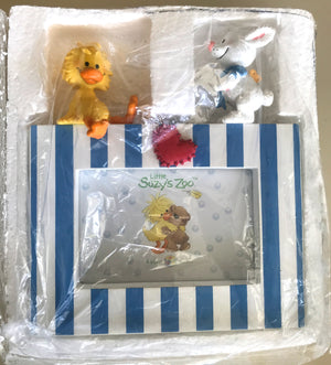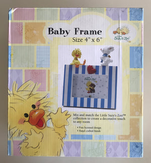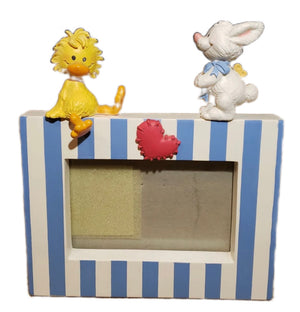 Este hermoso marco de fotos vintage de recuerdo de Little Suzy's Zoo presenta un patito Witzy sentado tranquilamente en la parte superior izquierda, con su amiga la conejita Lulla mirando al frente a la derecha. Un gran corazón rojo está estampado en el centro del marco, justo debajo de ellos. ¡Este adorable marco de fotos de recuerdo con rayas blancas y azules mostrará una foto favorita de tu pequeño! Un gran regalo para baby shower para un bebé recién nacido o una futura mamá y un complemento único y coleccionable para la habitación de cualquier niño pequeño.