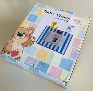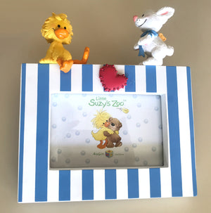 Marco de fotos de recuerdo para guardería de animales bebés con diseño de pato Witzy y conejito Lulla del zoológico de Little Suzy para fotografías de 4 x 6 pulgadas con rayas azules y blancas