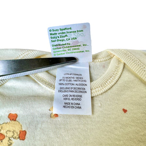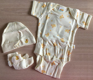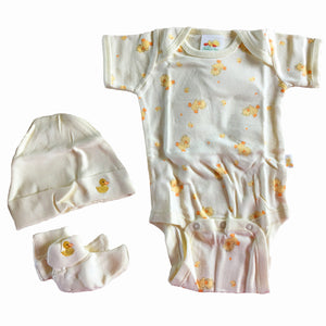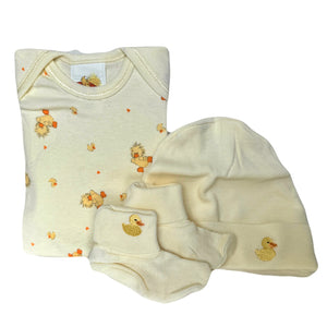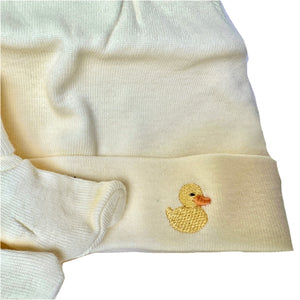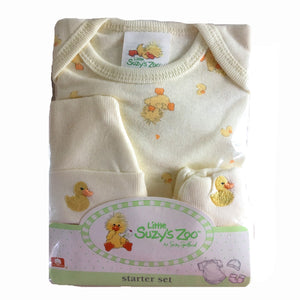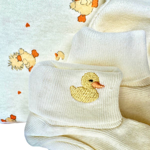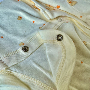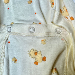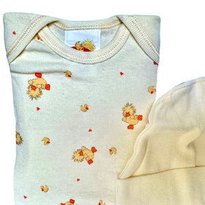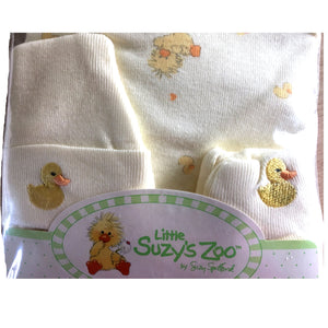 Conjunto de inicio vintage para bebé de 4 piezas Little Suzy's Zoo, mono de una pieza, ropa interior amarilla con gorro de pato Witzy, patuquitos, regalo para baby shower de 0 a 3 meses/recién nacido
