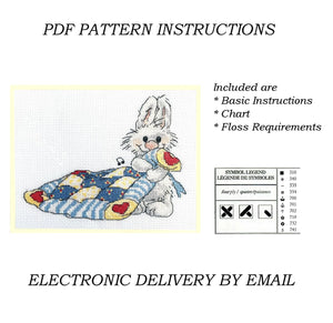 Gráfico de instrucciones en PDF para punto de cruz de conejito blanco "Snuggle Up" con manta del zoológico de Little Suzy, 7" x 5"