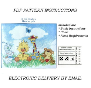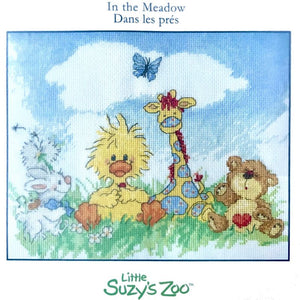Gráfico de instrucciones en PDF de patrones de punto de cruz de animales bebés en el prado del zoológico de Little Suzy: Witzy Ducky, Lulla White Bunny, Boof Bear, Patches Giraffe, 8" x 10"