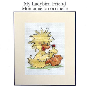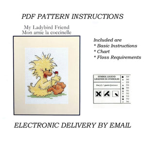 Instrucciones del patrón en PDF del gráfico de punto de cruz contado del pato amarillo bebé con mariquita del zoológico de Little Suzy, 3" x 4"