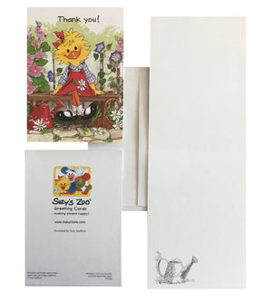 Tarjeta de felicitación de agradecimiento con sobre de Suzy's Zoo Suzy's Garden Corner - Suzy Ducken con flores