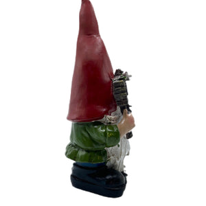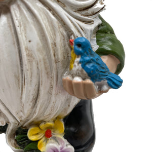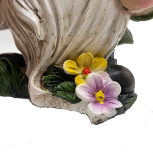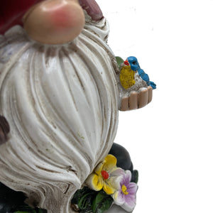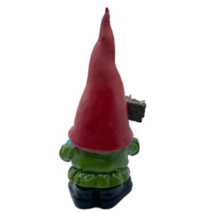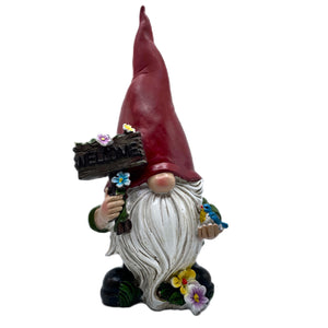 ¡No hay lugar como el hogar! Este encantador gnomo con sombrero rojo te da la bienvenida a ti o a tus visitantes con su cartel de bienvenida. El gnomo está hecho de resina y tiene un aspecto tallado. Lleva un sombrero rojo, una camisa verde y botas negras y sostiene un cartel de madera de "Bienvenido" con flores rosas y azules en una mano y un pequeño pájaro azul y blanco en la otra. ¡Colócalo al aire libre en un lugar protegido o en el interior para darle un toque de encanto boscoso!