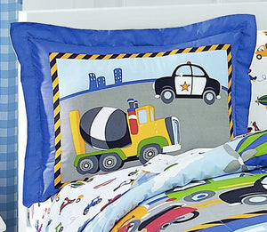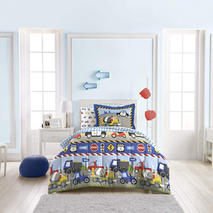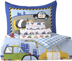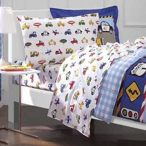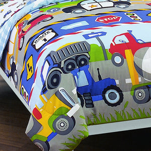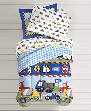 Juego de edredón de 5 piezas para niños con diseño de coches, camiones, aviones y coches de policía, cama en una bolsa