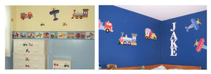 ¡Tu pequeño se divertirá muchísimo con este mural de pared de vehículos de transporte de trenes, aviones y camiones!
