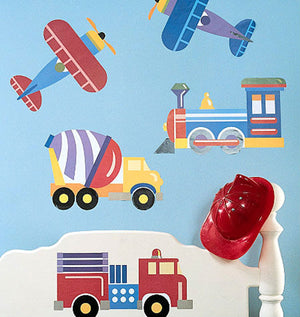 Mural de papel tapiz con trenes, aviones y camiones de bomberos para decoración de pared de habitación de niños - Calcomanías grandes