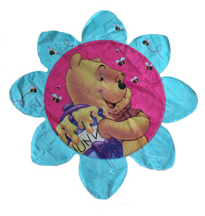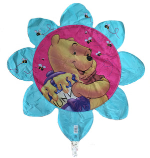 Este globo gigante con forma de girasol presenta a Winnie The Pooh con su "maceta de miel" y abejas dando vueltas a su alrededor. El centro de la flor es de color rosa intenso y los pétalos son de color azul verdoso. Úselo para cualquier ocasión: cumpleaños, amistad, amor, San Valentín o más. Este globo único ya no se fabrica y es difícil de encontrar.