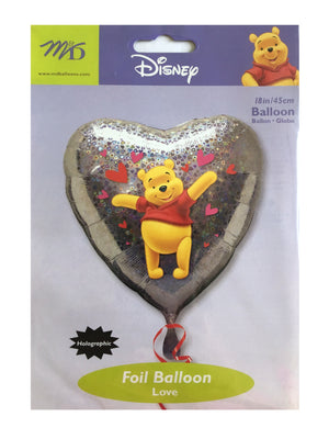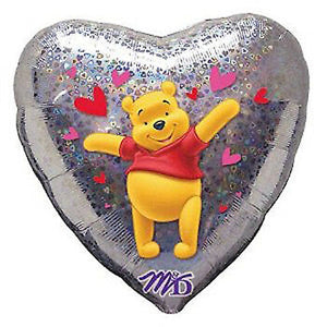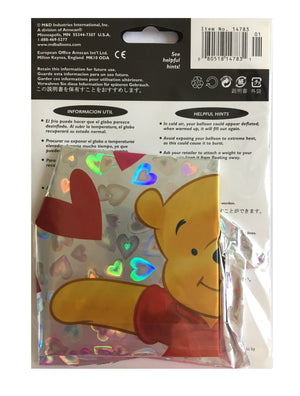 Este globo holográfico plateado con forma de corazón presenta a Winnie Pooh sonriendo con los brazos abiertos y corazones rojos flotando a su alrededor. Muestra tu amor, amistad y apoyo con este globo único. Ya no se fabrica y es difícil de encontrar.