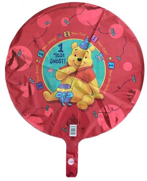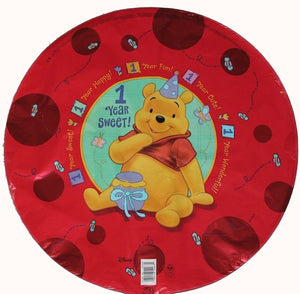 Este globo rojo de Winnie Pooh muestra a Pooh con un sombrero de fiesta, sentado con su tarro de miel y escribiendo "¡1 año dulce! ¡1 año feliz! ¡1 año divertido! ¡1 año lindo! ¡1 año maravilloso!" alrededor de él y con abejas flotando alrededor. Celebra el primer cumpleaños de tu bebé con este globo único en su tipo. Ya no se fabrica y es difícil de encontrar.