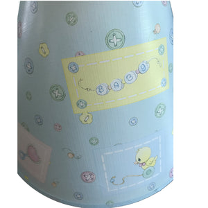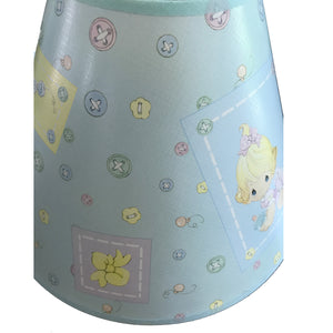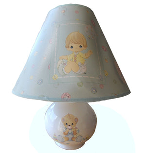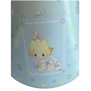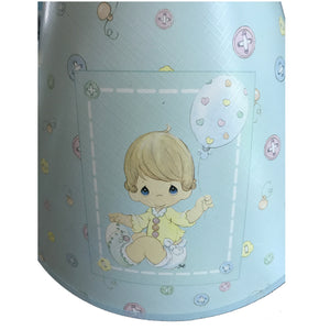 Esta adorable pantalla de lámpara de guardería de época de Precious Moments presenta una imagen de un bebé niño en un lado y una niña en el otro. La base de cerámica de la lámpara muestra un adorable osito de peluche sosteniendo una manta y juguetes esparcidos por todas partes.