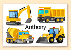 Mantel individual personalizado para niños con equipo para camiones de construcción, 18" x 12" con alfabeto - Custom USA