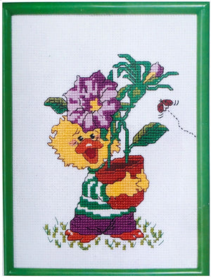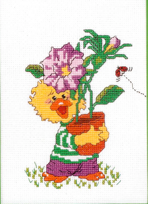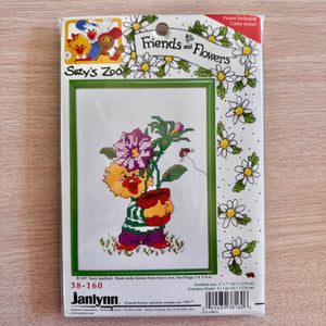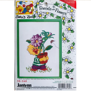 Kit de punto de cruz vintage con marco Suzy's Zoo Friends & Flowers Chuckie Ducken Pato amarillo con maceta 1997
